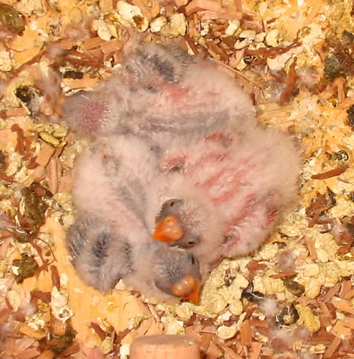 Die drei Kleinen beginnen allmählich, sich für die Außenwelt zu interessieren, zumindest Hütchen (rechts) und Klein-Donnerstag (links). Noch ein bisschen mehr Ruhe braucht dagegen Däumling (oben, schlafend), das Nesthäkchen. Aber wer aufholen will, muss ordentlich fressen und sich ansonsten schonen. Hütchen könnte, so weit man das jetzt schon beurteilen kann, vom Gefieder her eher nach der Mutter (hauptsächlich rosa) kommen. Klein-Donnerstag und Däumling werden wohl eher dem Vater ähneln. Aber bis dahin müssen ihnen noch viele Federn wachsen. Die Küken sind ja erst 13 bzw. 14 Tage alt. |