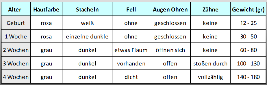 Igeljunge werden bis zu einem Gewicht von etwa 230 Gramm von ihrer Mutter gesäugt. Verwaiste Igelchen brauchen einen adäquaten lactosefreien Muttermilch-Ersatz, wenn sie von Menschen aufgezogen werden. Igelbabys oder winzige Igeljunge aufzuziehen, erfordert viel Zeit, Geduld, großes Engagement und vor allem Erfahrung. Die besten Überlebenschancen haben die Winzlinge, wenn sie schnell in die Obhut von ausgewiesenen Fachleuten, z.B. in Igelauffangstationen, kommen. Sehr gute Informationen von Pro Igel e.V. zur Aufzucht von verwaister Igelsäuglinge sind hier zu finden. Wie alt ist das Baby?Über Gewicht, Aussehen und Stadium der Zahnbildung lassen sich Rückschlüsse auf das Alter von Igelbabys ziehen. Orientiert man sich am Gewicht allein, kann man sich dabei täuschen lassen. Denn ist z.B. stacheliges Findelkind unterernährt und sehr leicht, wird sein Alter gern unterschätzt.
