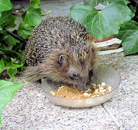 (Zu)Füttern – ja oder nein? ...Wenn Ihr Garten naturnah gestaltet ist mit heimischen Stauden, Sträuchern, Bäumen und Wildpflanzen, wenn Sie dazu nicht jeden Strauchschnitt, jeden Ast und jedes Blatt gleich wegräumen, sondern als Haufen in versteckten Ecken aufschichten, haben Sie schon viel für Igel und ihre Nahrungstiere getan. Igel sollten in Ihrem Garten nicht nur Schnecken und Regenwürmer finden, sondern auch Tausendfüssler, Käfer, Larven und ähnliches. Dennoch ist es kein Fehler, Igeln als Starthilfe nach dem Winterschlaf ab ca. Ende April/Anfang Mai und ab September gutes (!) Futter anzubieten, damit sie Fettreserven (wieder) aufbauen können. Wie aber sieht ein guter Futterplatz aus?