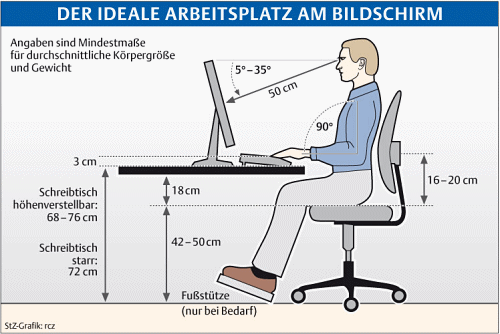 Sich rückenschonend zu bewegen, lehren Rückenschulkurse, etwa bei Krankenkassen, im Betrieb oder in Reha-Einrichtungen. Charmant und einprägsam sind die kleinen Filmclips zum Umgang mit Lasten auf der Website der Europäischen Agentur für Sicherheit und Gesundheitsschutz am Arbeitsplatz. Neben Bewegung und einem gesunden Körpergewicht sind Ausdauersport und etwas Kräftigungstraining empfehlenswert – schon zweimal 30 Minuten pro Woche können genügen. Wichtig ist eine gründliche orthopädische Eingangsuntersuchung vor dem Rückentraining. Die Trainer im Studio sollten gut geschult sein und – damit die richtigen Muskeln gestärkt und die Übungen korrekt durchgeführt werden – das individuelle Trainingsprogramm kontinuierlich kontrollieren. Ideal ist es, wenn im Fitnessstudio ein Arzt oder Krankengymnast begleitend zur Verfügung steht. Wie ein guter Bildschirmarbeitsplatz aussieht, zeigt die Grafik im Haupttext. Auf der Internetseite der Bundesanstalt für Arbeitsschutz und Arbeitsmedizin gibt es dazu weitere detaillierte Infos. »Mein Schweinehund und ich« heißt ein Online-Programm der Verwaltungsberufsgenossenschaft. Es liefert umfassende Infos zur Rückenprävention, von Anatomie über Arbeitsplatzcheck bis zu Stressbremsen und Sportempfehlungen. |
